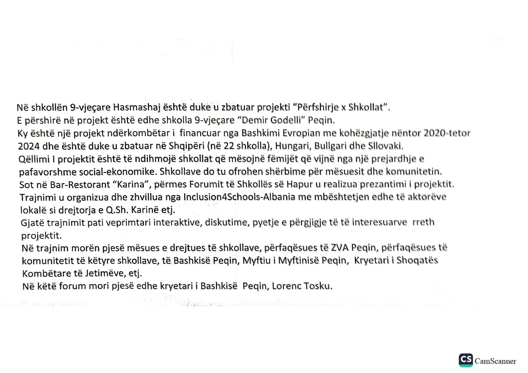 Në vijim të zbatimit të projektit "Përfshirje x Shkollat" në shkollën 9-vjeçare Hasmashaj, përmes Forumit të Shkollës së Hapur, në mjediset e Bar-Restorant "Karina" u zhvillua një tjetër aktivitet nga Inclusion4Schools-Albania me mbështetjen edhe të aktorëve lokalë si : punonjësja sociale e shkollës Hasmashaj, përfaqësuesja e Njësisë për Mbrojtjen e Fëmijëve, Bashkia Peqin etj. Në aktivitet u realizuan veprimtari interaktive, diskutime, pyetje e përgjigje rreth : 1.Bullizmit në shkolla dhe rolit të komunitetit në zgjidhjen e konflikteve; 2.Rolit të Njësisë për Mbrojtjen e Fëmijëve në zgjidhjen e problematikave të dhunës. Në takim morën pjesë mësues e drejtues të shkollave, drejtorja e ZVA Peqin, nënprefekti i nënprefekturës Peqin, përfaqësues të komunitetit të shkollës, të Bashkisë Peqin, Myftiu i Myftinisë Peqin, Kryetari i Shoqatës Kombëtare të Jetimëve etj.